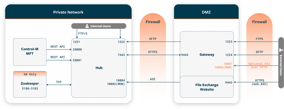 Internal users can only connect directly to the Hub, but external users must connect via the Control-M MFT Enterprise Gateway in the DMZ.