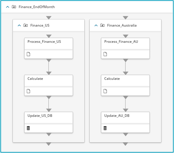This diagram shows a small portion of an organization's workflow that processes end-of-month finances. Inside the main folder are two other folders: one for US finances, and one for Australia finances. The US and Australia folders each contain three jobs, with each handling a specific financial task. The first job runs a script that processes finance information, the second job runs a script that performs calculations, and the third job updates the relevant database with the required information. The arrows indicate the flow of one job to the next. The use of folders and naming makes it easier to understand what each job does and how they work together.