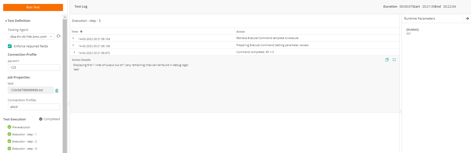 This procedure describes how to run a test execution of the plug-in, to ensure that plug-in jobs can complete successfully. In each test execution, you can test specific scenarios by selecting a specific target Agent and setting specific attribute values. Test results provides runtime information and log messages from the plug-in steps. For more information, see Plug-in Test Results.